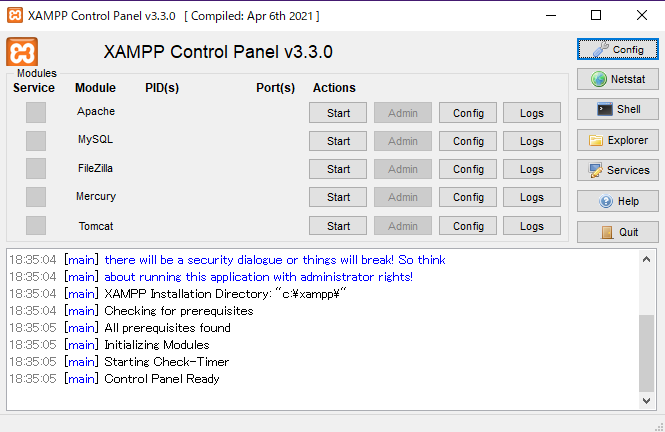 - 「XAMPP Control Panel」を起動し、ApacheとMySQLをstartで立ち上げる