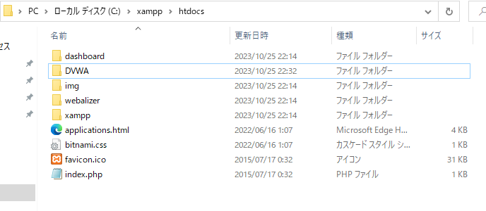 - ダウンロードしたDVWAを解凍し、C:\xampp\htdocsにコピーする