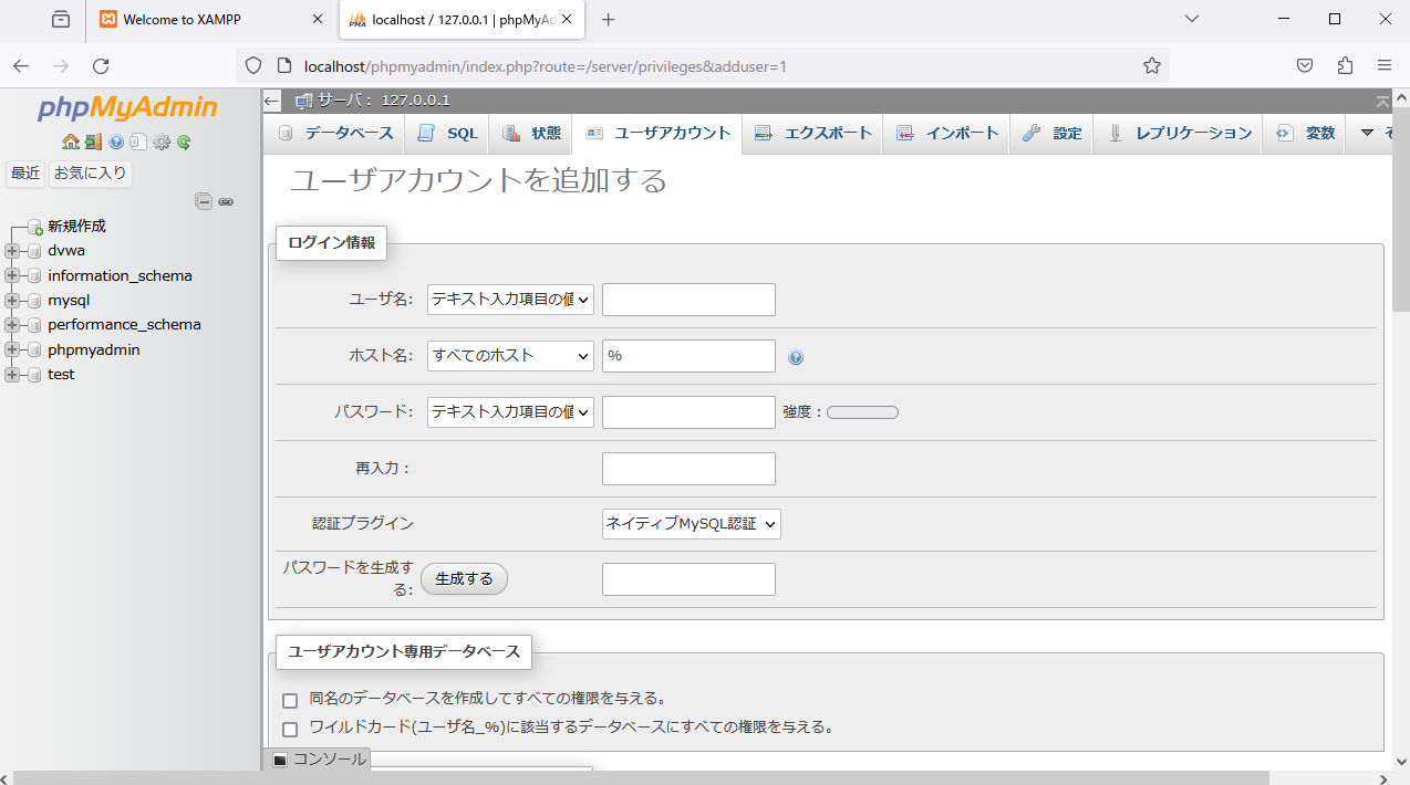 - XAMPP Control PanelのMySQL欄Adminをクリック ユーザーアカウント→ユーザーアカウントを追加する、から新規ユーザーを追加